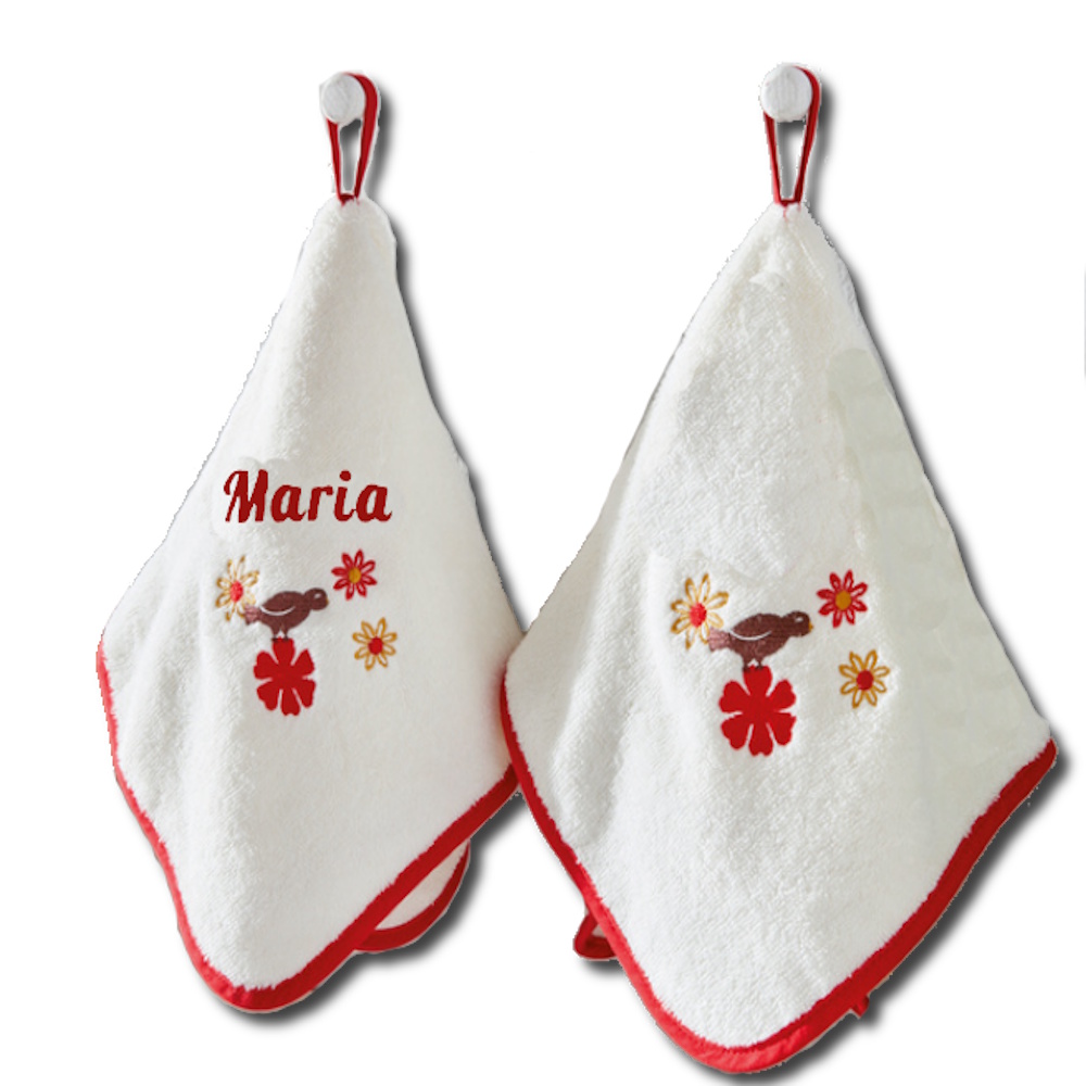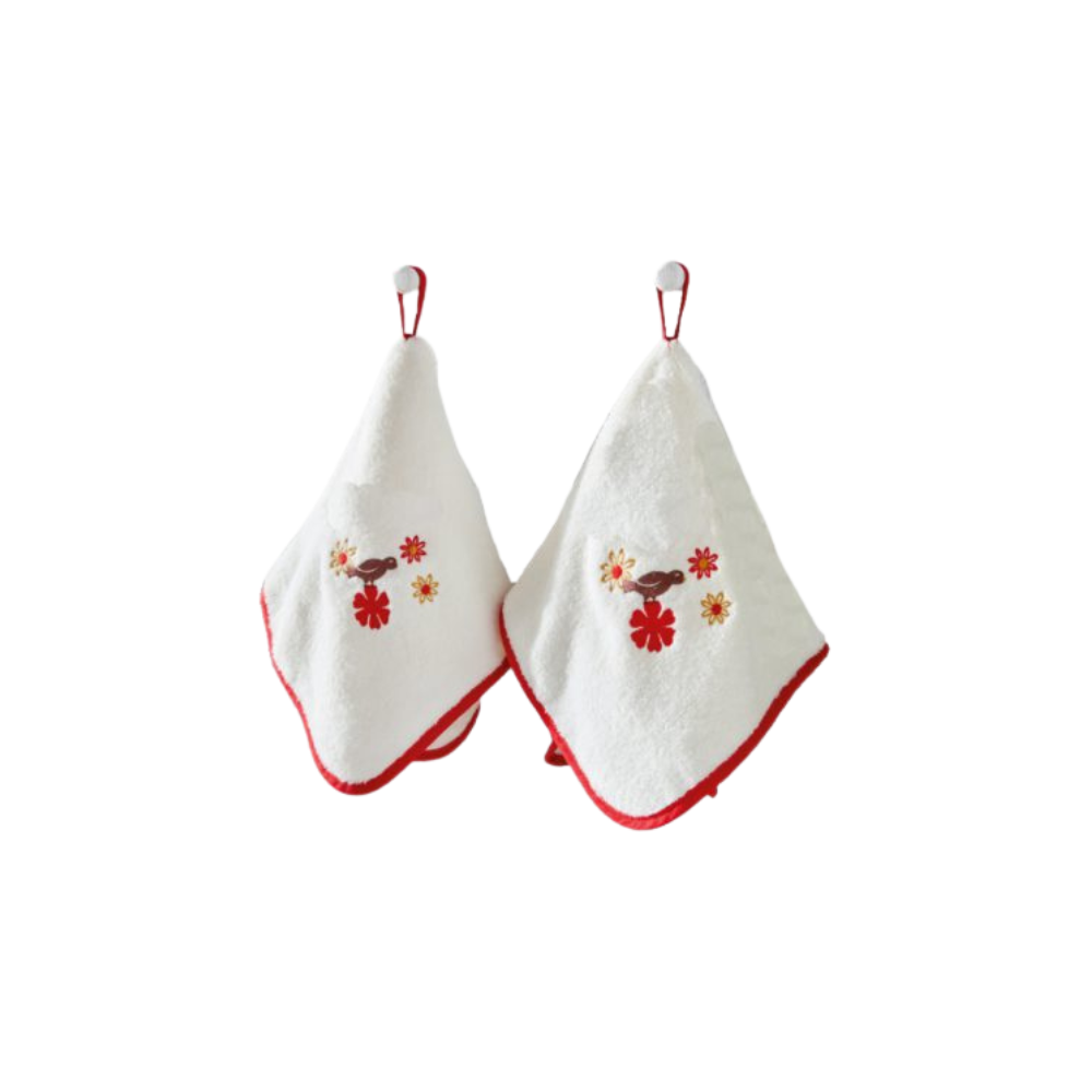 Complete a sua cozinha com este conjunto de 2 toalhas em algodão puro, muito macias e absorventes. As suas presilhas colocadas de forma original ao centro, destacam a beleza dos seus delicados bordados.