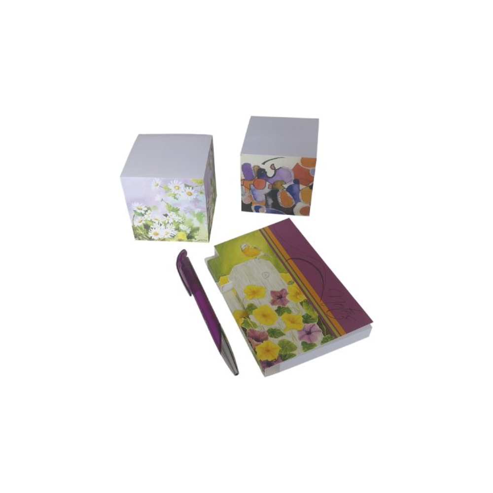 Um lote de artigos indispensáveis em casa ou no trabalho, que o fará lembrar-se de tudo. Inclui: um bloco de folhas destacáveis (8 x 8 x 8 cm), um bloco de folhas “post-it” (7,5 x 7,5 x 7,5 cm) e um bloco de notas com capa e caneta (9,5 x 14 cm)